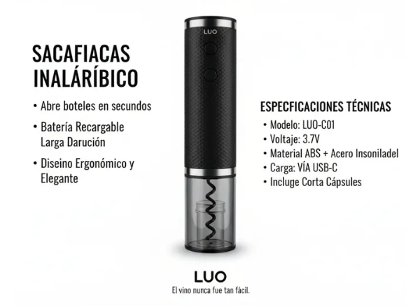 Fácil de usar Inalámbrico, funciona con una batería recargable y viene con un cable USB Ergonómico, cabe perfectamente en la palma de la mano Diseñado para adaptarse a casi cualquier tipo de botella de vino tradicional Tiempo aproximado para abrir cada corcho: 7 segundos Viene con una base que también sirve de sellador Capacidad: abre más de 30 botellas con la batería completamente cargada Tiempo de recarga de la batería 8 h